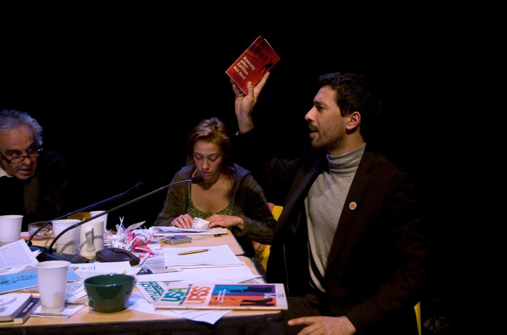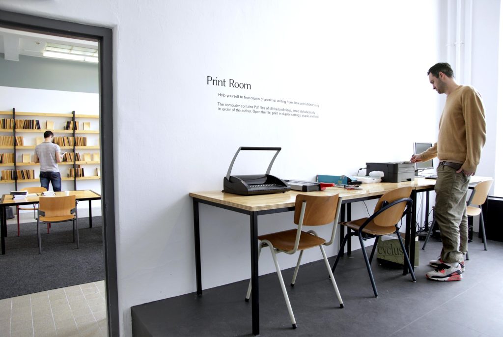 This event series began as a public program at the first full presentation of Yours in Solidarity, a work that drew on the collection of anarchist writings at theanarchistlibrary.org. Printed copies of all titles archived online were made available in a reading room, where visitors could make their own copies free of charge and take them home. In each of the Reading Anarchism events, prominent makers and thinkers were asked to choose a title, read an excerpt of it to an audience, and host a discussion on it.