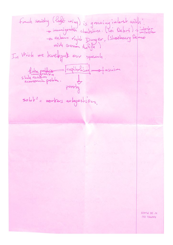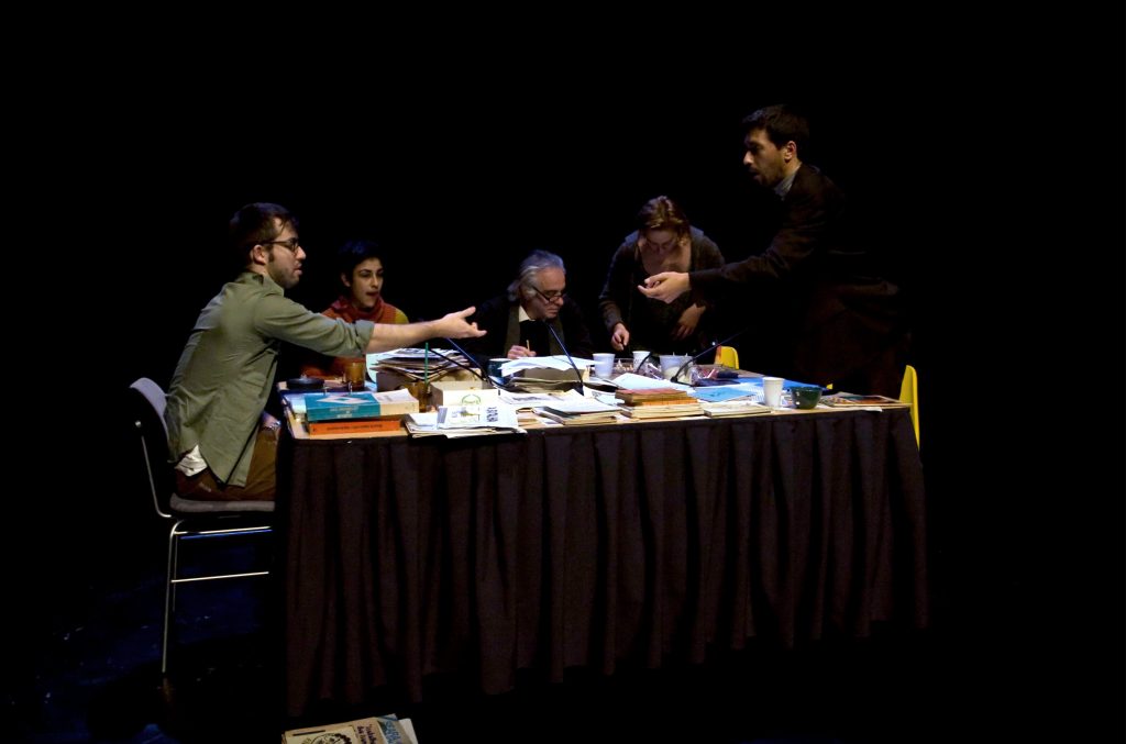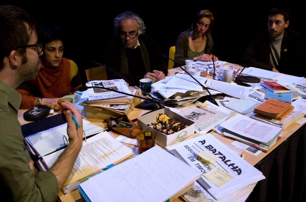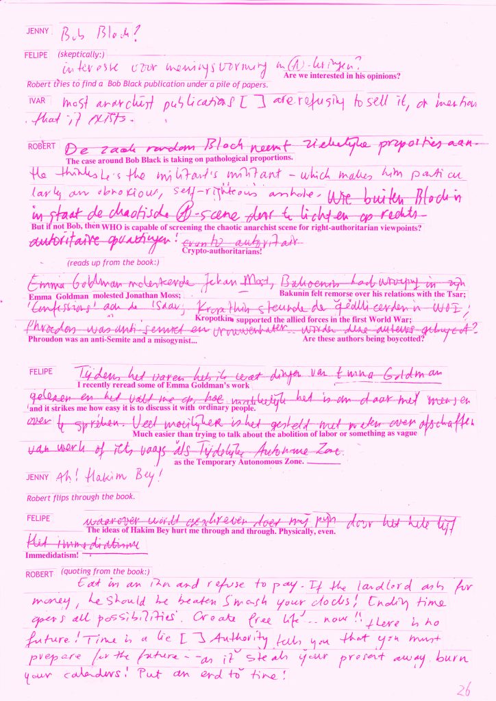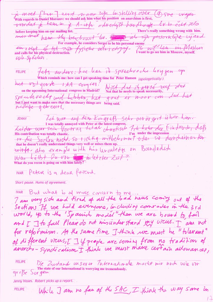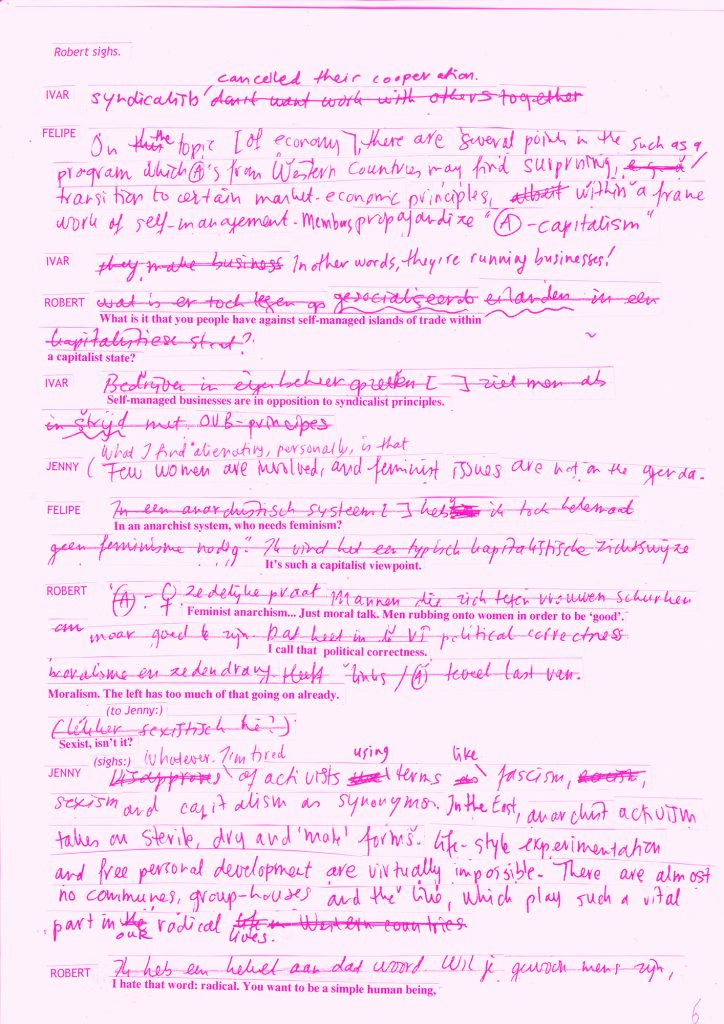 This one-act play was commissioned for an exhibition commemorating the centenary of the Portuguese Revolution in 1910. It is the first work based on Karl Max Kreuger’s correspondence archive and in that sense a prologue to Yours in Solidarity. Hand-copied quotations from the hundreds of letters written between anarchist groups and individuals were translated into English. Otherwise unaltered, the quotes were used to compile a script for a small gathering of anarchists, all of whom had different political affiliations and temperaments. Chain-smoking and surrounded by magazines, books, and paperwork, the members of the meeting read from the letters their group received from around the world.