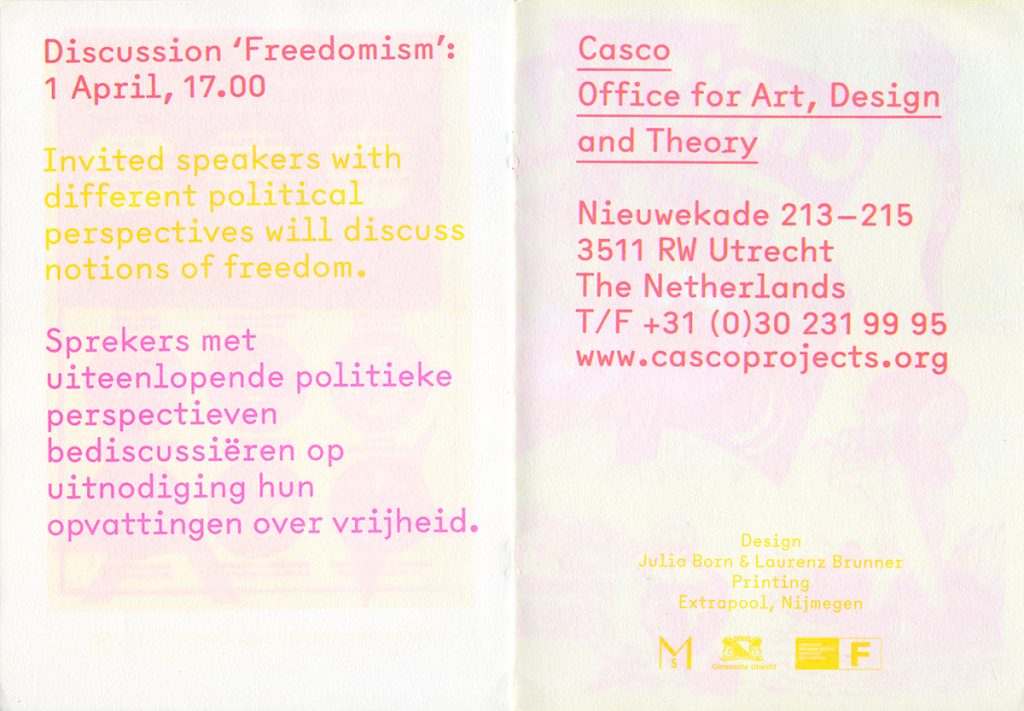 Participants included Lise Autogena, Maria Barnas, Frans Bromet, Geert Lovink, Elena Loizidou, Jonas Staal, Yoonis Osman Nuur, Kees Hin, Mariko Peters, Melanie Bonajo, Katja Sokolova, Richard John Jones, Jay Jordan, Kathrin Böhm, Jan Ritsema, Ahmet Ogüt, Nienke Terpsma, Bea de Visser and Mihnea Mircan.
