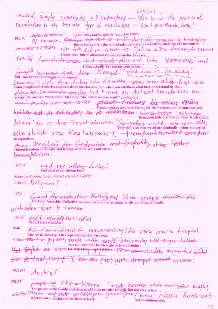 Subsequently, the newly created characters appeared in a scripted work, representing what might happen if the international correspondents were to meet today. Thus, the Russian Stirnerites and the American Syndicalists of the early ’90s still argue about individualized versus organized anarchism. The Spanish anarchists have lost little of their revolutionary fire. But the World Wide Web and unbridled globalization has altered the activist dynamic. The resulting video installation is named after the much-used anarchist letter sign-off: “Yours in Solidarity.”
